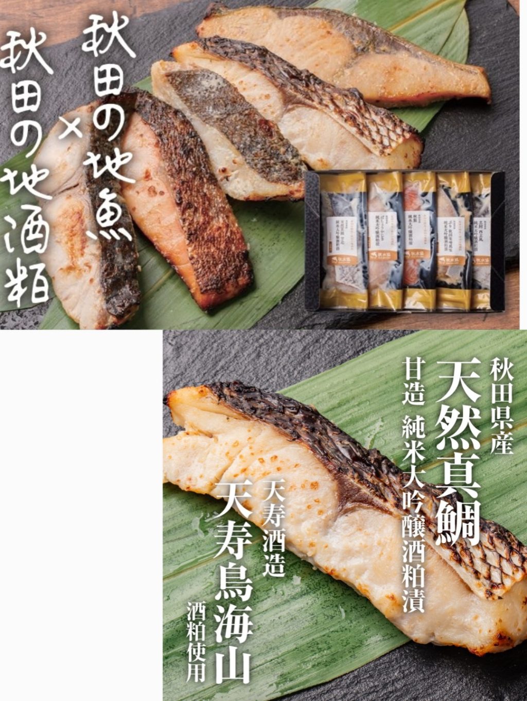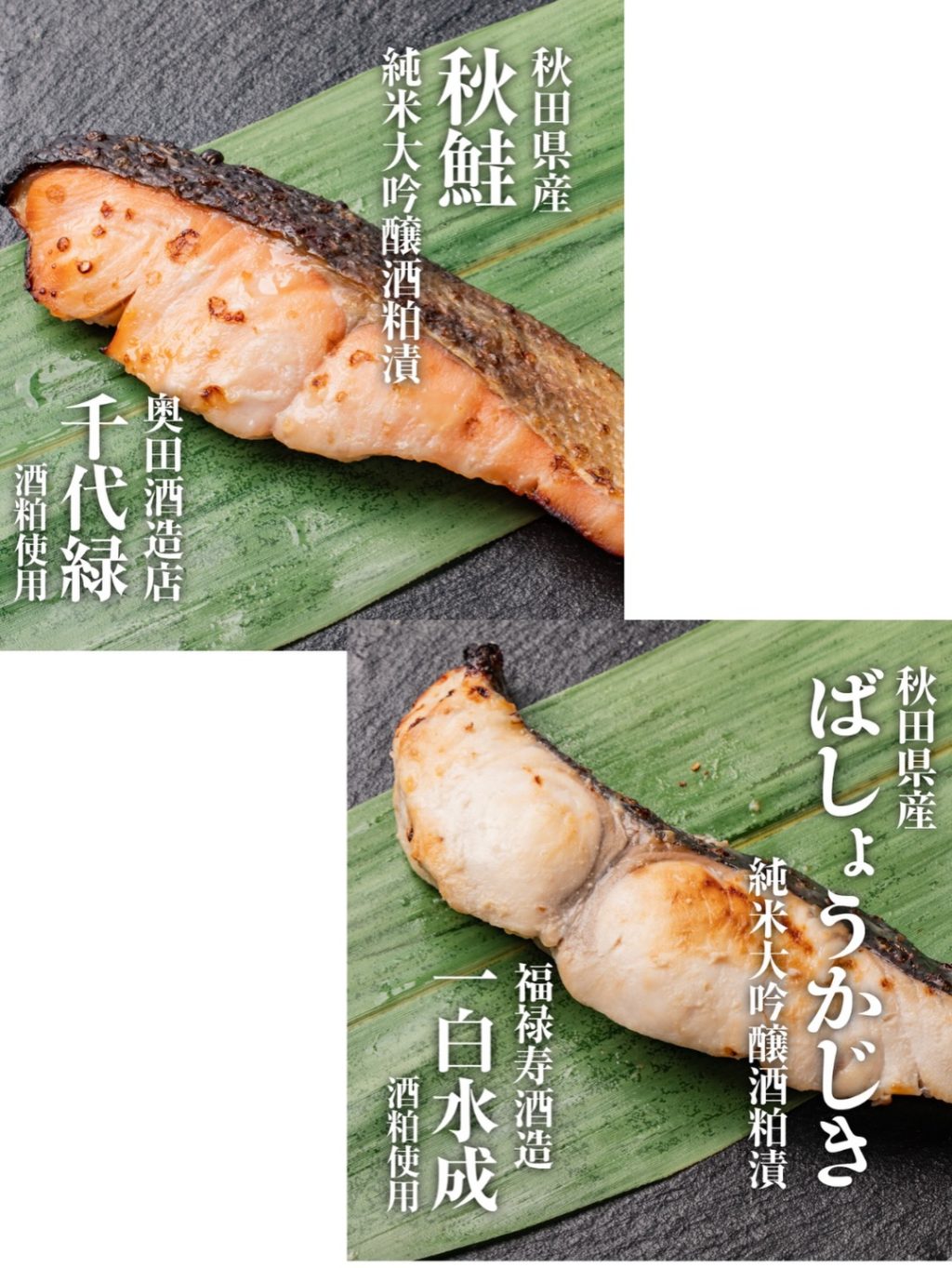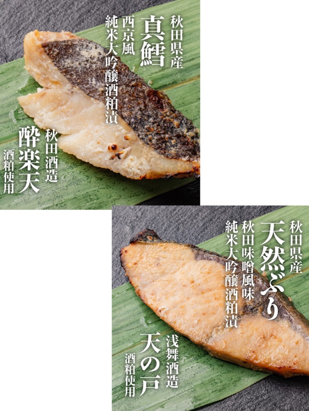 秋田ならではの新たな水産加工品として、秋田で水揚げされた5魚種(まだい、ぶり、さけ、たら、ばしょうかじき)の切り身を、美酒王国秋田県内の五つの酒蔵(秋田酒造、浅舞酒造、奥田酒造店、天寿酒造、福禄寿酒造)の純米大吟醸酒粕をつかった粕漬を商品化いたしました。